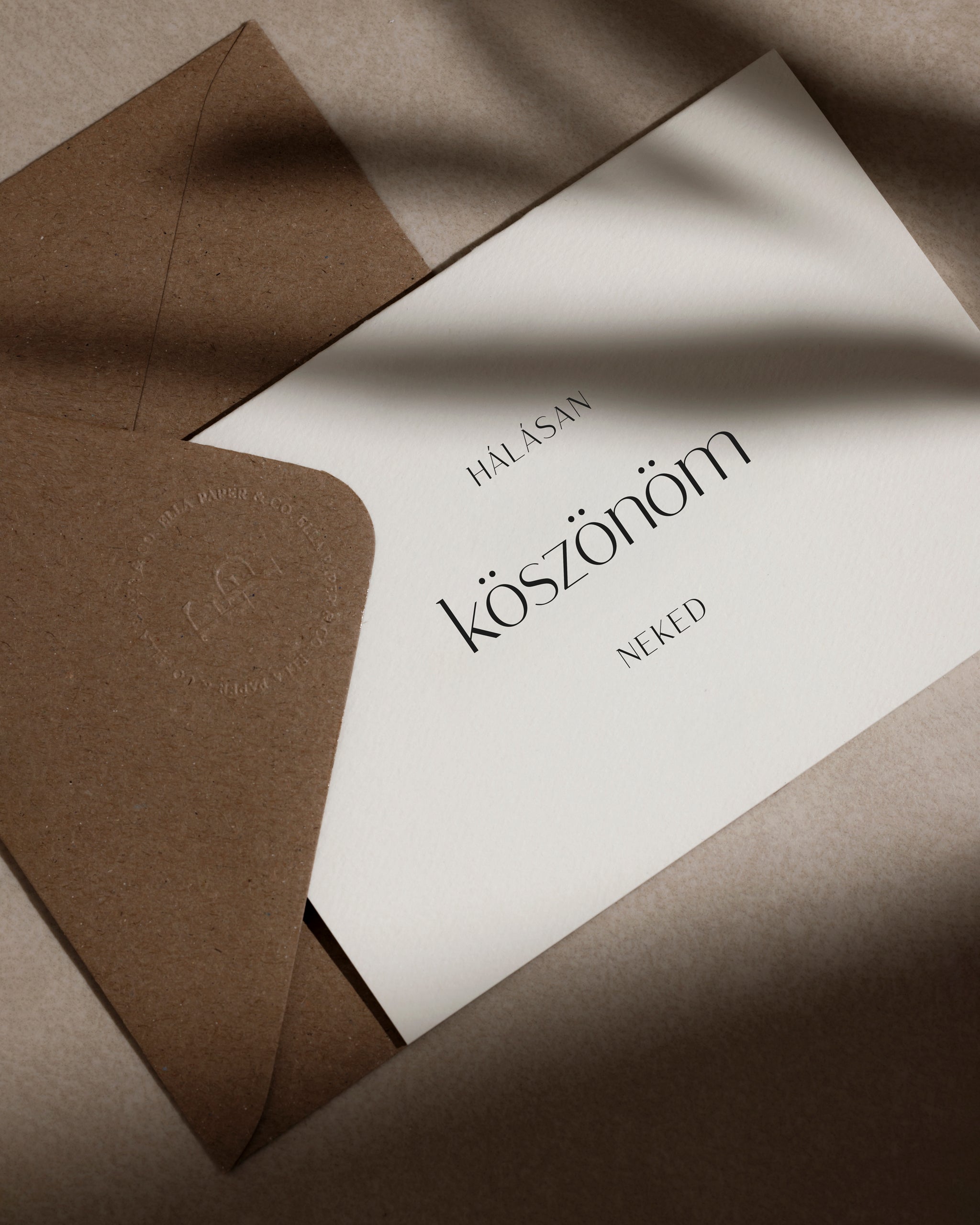 Kihajtható üdvözlőlap texturált, luxus papírból, finom tipográfiával és környezetbarát, domborozott borítékkal A6 méretben.