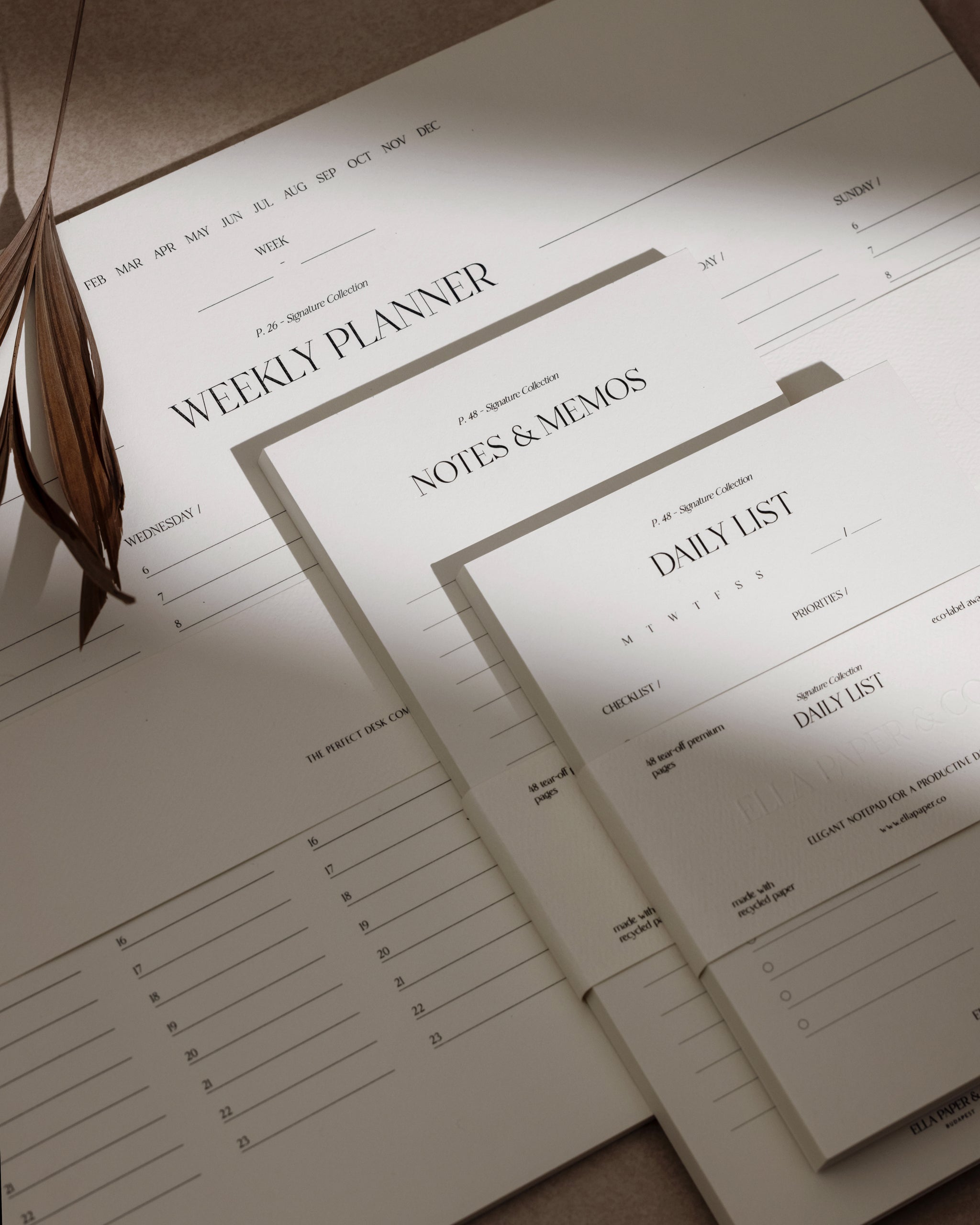 Szabadon dátumozható asztali heti tervező napi és óránkénti beosztással, prioritások és extra gondolatok szekcióval. 26 hétre elegendő 120g/m²-es prémium papírlapot tartalmaz.